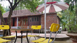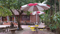Set in a typical historical Vietnamese garden with a small lake and outside